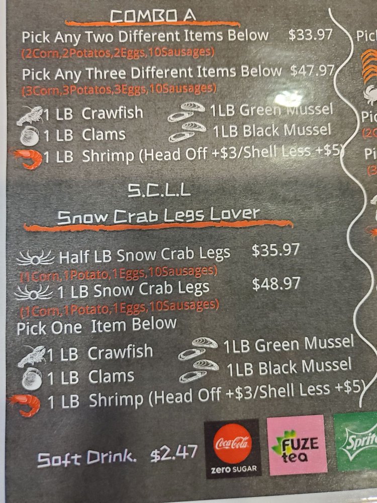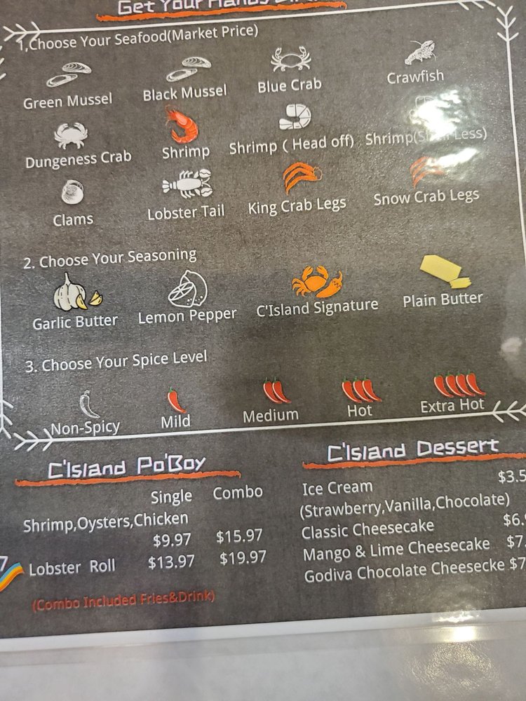 For the main event, choose from a variety of seafood that includes Dungeness Crab, Lobster Tail, and Head-On Shrimp, all prepared with your choice of seasoning—be it Garlic Butter, Lemon Pepper, or their signature C Island spice. The combo platters offer a delightful way to mix and match strategically selected seafood with tasty sides like corn and potatoes, making it a feast for seafood lovers.